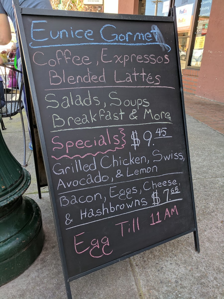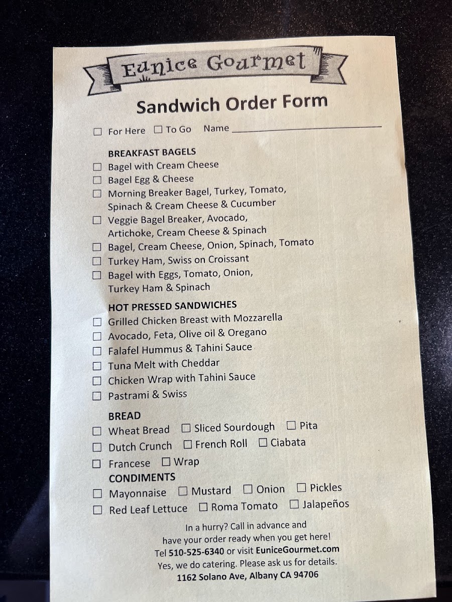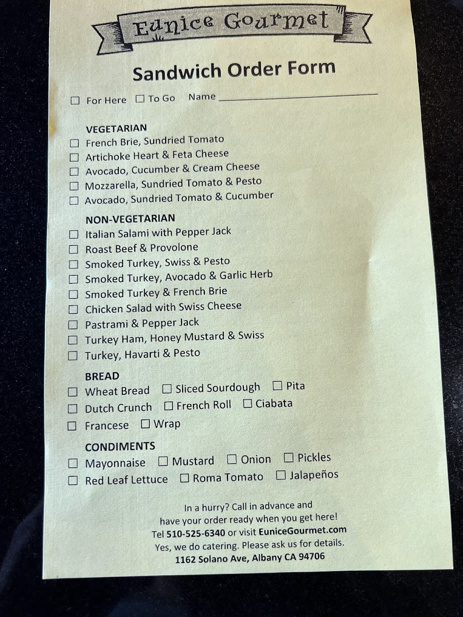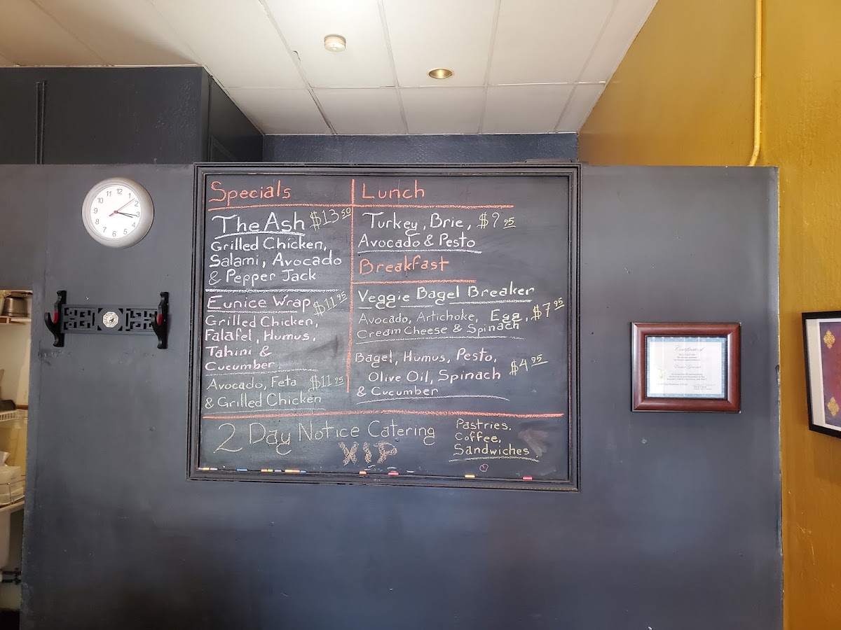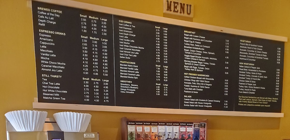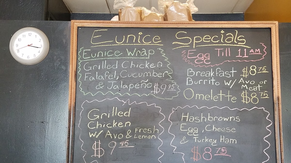 The menu at Eunice Gourmet Café offers a delightful variety of options catering to different tastes, from beverages to hearty meals. For coffee lovers, there's the Coffee Of The Day and specialty drinks like Espresso and Americano, along with options such as Cappuccino and Latte. Tea enthusiasts can enjoy selections like Chai Tea Latte and Hot Chocolate, while those seeking something cold can dive into iced options, including Iced Latte and Iced Americano. The café also serves creative Frappuccinos, including the Blended Vanilla Latte and Blended Mocha Spin. For smoothies, options like Strawberry, Banana, and Delux Smoothie are available, offering a refreshing twist. Breakfast offerings range from simple favorites like Bagel With Cream Cheese to more filling choices like the Breakfast Omelette/Burrito. Hot pressed sandwiches such as the Grilled Chicken Breast With Mozzarella and Tuna Melt With Cheddar are perfect for a satisfying lunch. The café also boasts a variety of salads like the Caesar Salad and Greek Salad, along with vegetarian sandwiches like Mozzarella, Sundried Tomato & Pesto. For meat lovers, options like Roast Beef, Horseradish & Provolone and Smoked Turkey, Swiss & Pesto provide rich flavors. For something a bit more special, try the Grilled Chicken W/ Avo & Lemon Fresh or the unique Eunice Wrap. With a mix of classic and inventive dishes, Eunice Gourmet Café offers a well-rounded menu suitable for any time of the day.
